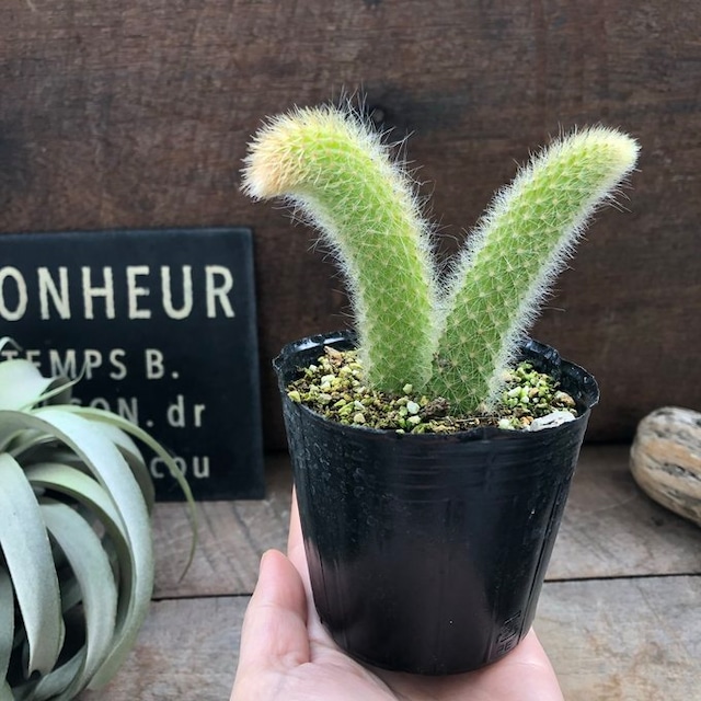 ご覧頂きありがとうございます。 おしゃれな『ヒルデウィンティラ』です。 別名ヒモサボテンです。 金色の細かく、柔らかめのトゲが全体を覆うように生えています。その姿は、猫の尻尾のようにも見えます。 株が小さいうちは直立しますが、育つに這うようになり、鉢から垂れ下がるように見えることから日本ではヒモサボテンと呼ばれるようになりました。 その姿は、まるで小動物のしっぽのように可愛いく愛着が沸きます。 ヒルデウィンティラは、細長く伸びた茎を細かい黄金色の針が覆っています。それほど太くならず長く伸びる品種です。 初心者の方でも育てやすいのでオススメです 3号ポットに入っています。1個のお値段です。 樹形は個体差があり、それぞれ違います。 あらかじめご了承ください。 育て方 冬は日当たりのいいところ、夏に近づくにつれ西日は避けて朝日がしっかり当たるか一日2時間程度直射日光が当たるようなところに置きます。 日光不足になると細くひょろひょろになりその後直射にあてても膨らむまでは時間がかかります。