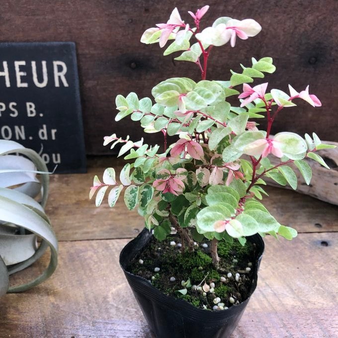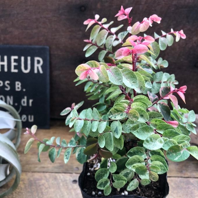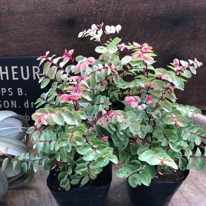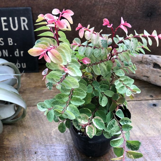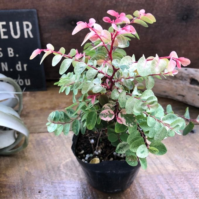 南洋諸島原産の常緑性の低木で、丸っこくて可愛らしい小判型の葉にピンクの斑入り