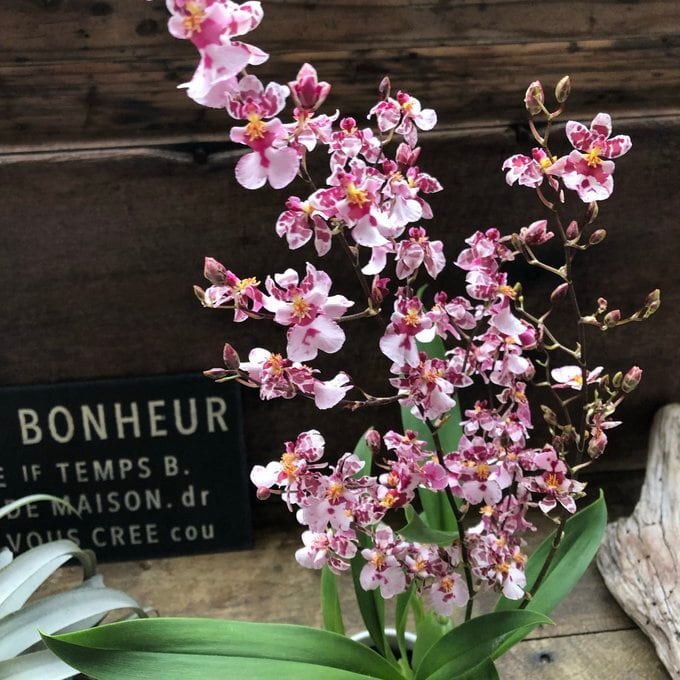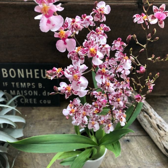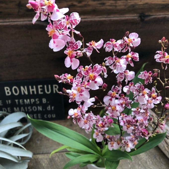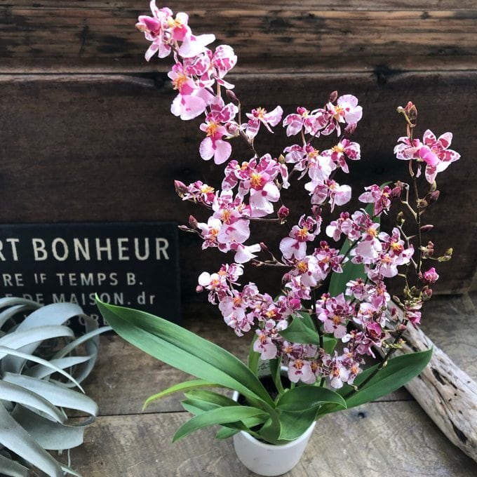 白×ピンクの小輪がふわっと咲き、甘いチョコレートのような香りが漂うオンシジューム『ムーラン』。優しい色合いで可愛らしく、花つき抜群。室内でも楽しみやすく、ギフトにもおすすめの洋ランです。
