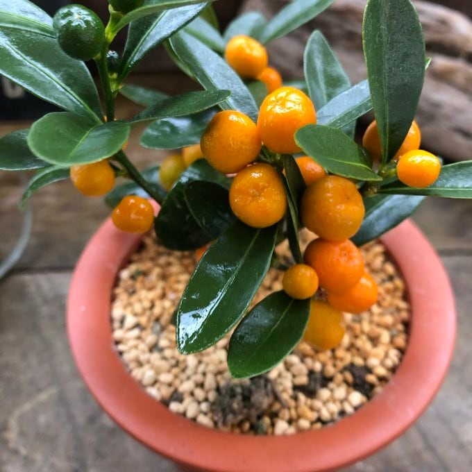 小さくてかわいいオレンジの実が長く楽しめる盆栽です。