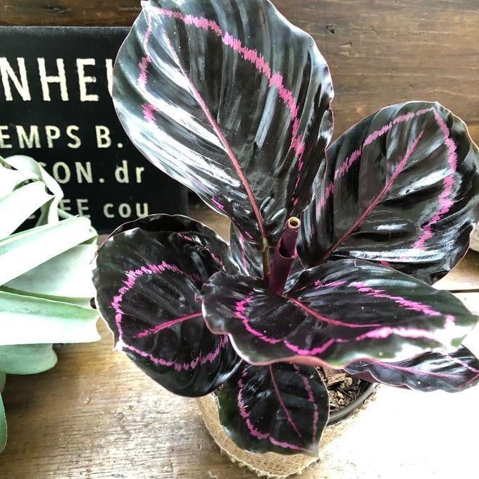 漆黒の葉に、その周りを取り囲むピンクの洒落たラインで縁取るカラテアです。