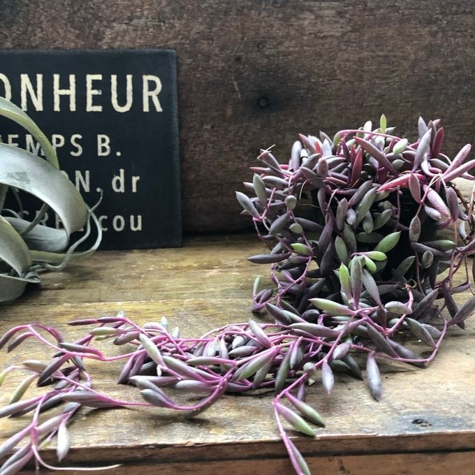 月を細長くした多肉質の葉っぱををもち、ネックレスのように茎を長く伸ばして地を這うように育つ多肉植物です