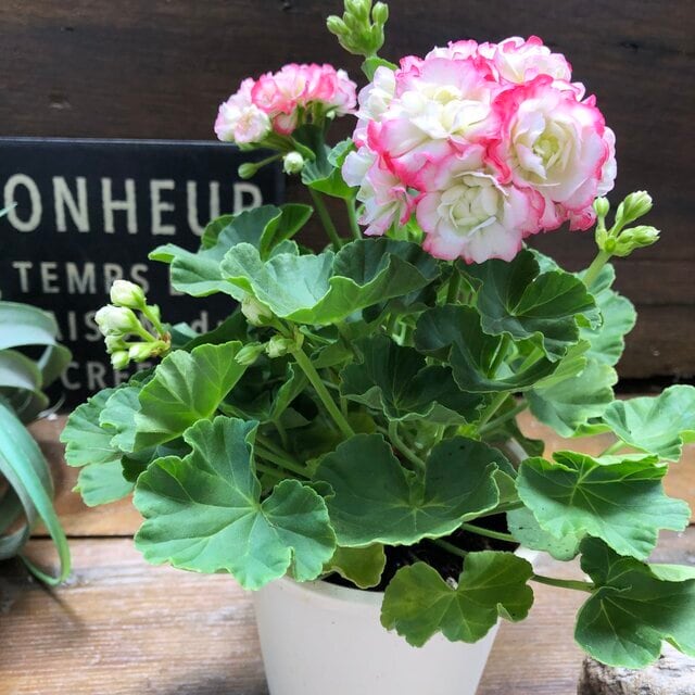 バラのような豪華な八重咲きのゼラニウムの「アップルブロッサム」です。