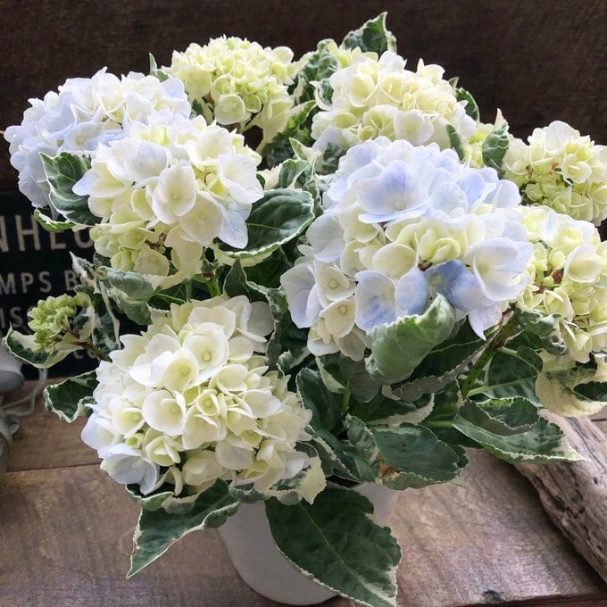 美しい斑入りの葉と、やわらかな色合いの花が魅力のアジサイ「アイコンキャラクター」。