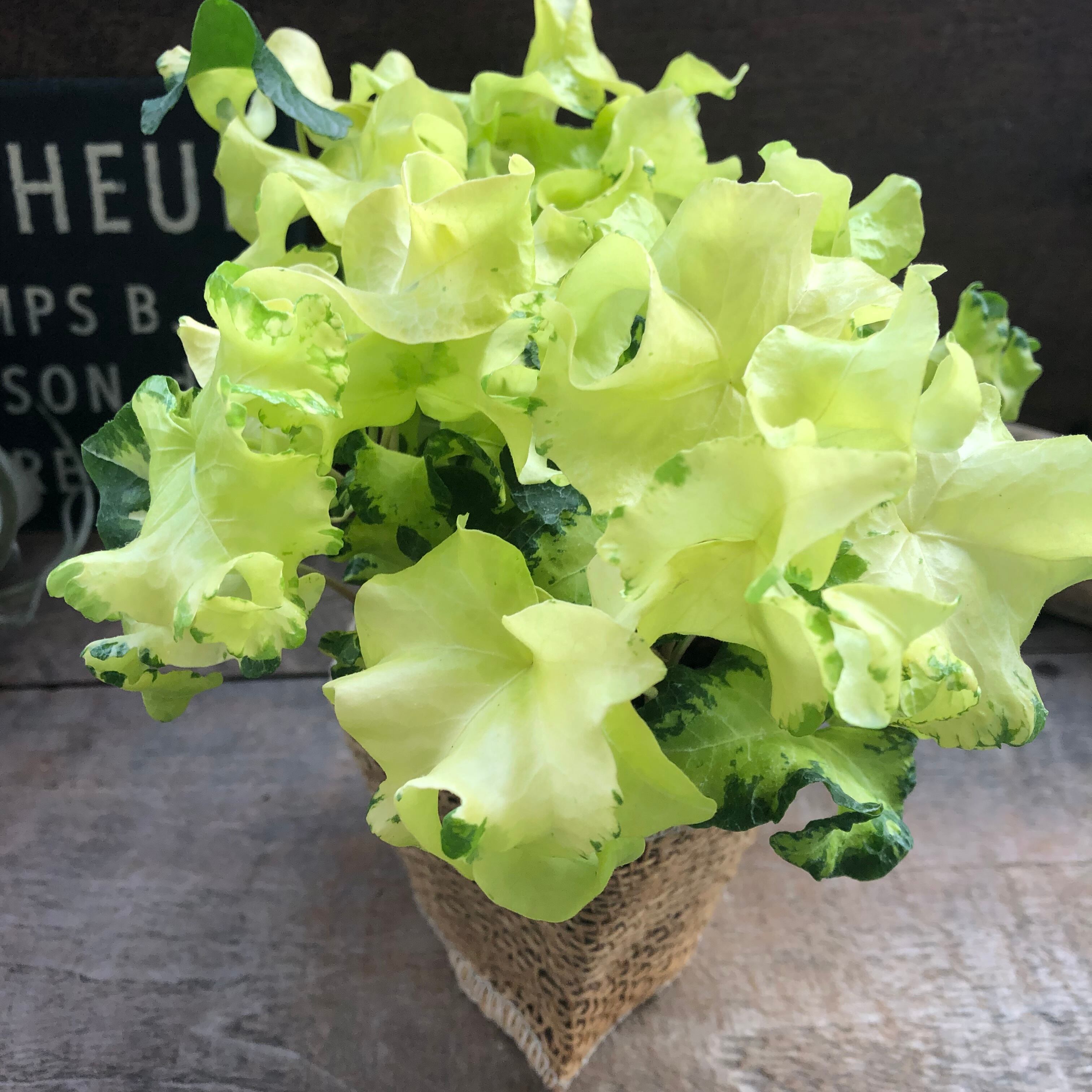 一般的なへデラと違い、イエローの華やかな斑入りの葉で、フリフリなカールが珍しい植物です。